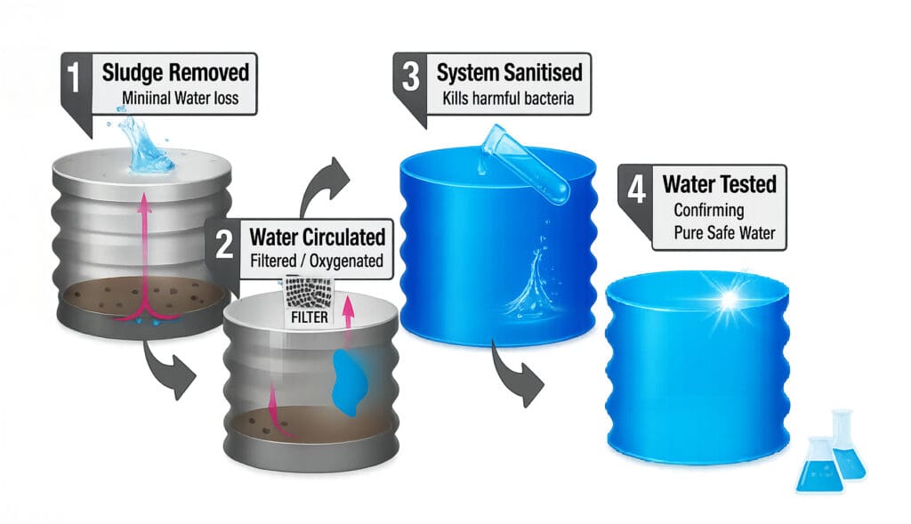 We don’t just remove sludge — we restore your water to full health, combining deep cleaning, sanitisation, and aeration for safe, great-tasting water that stays cleaner for longer.